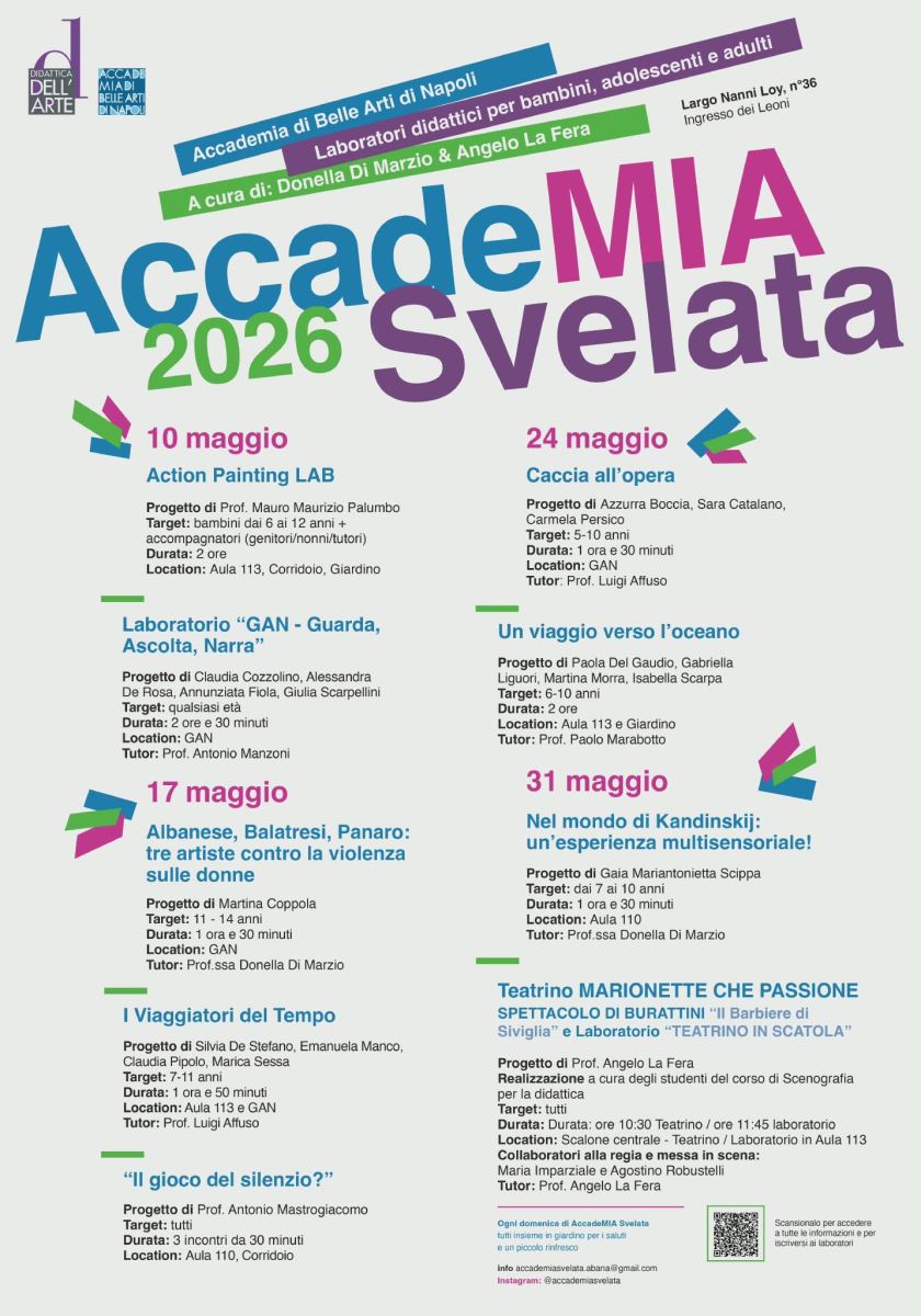 Lo storico progetto della scuola di Didattica dell'arte dell'Accademia di Belle Arti di Napoli da molti anni si apre alla città con laboratori didattici e attività ludico-creative progettate e svolte dai docenti e dagli allievi.