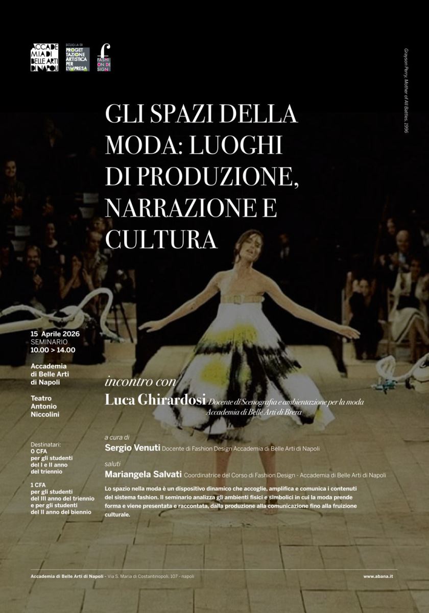 L’Accademia di Belle Arti di Napoli promuove il seminario “Gli spazi della moda: luoghi di produzione, narrazione e cultura”, a cura del docente Sergio Venuti, con la partecipazione di Luca Ghirardosi, docente di Scenografia e ambientazione per la moda presso l’Accademia di Belle Arti di Brera.