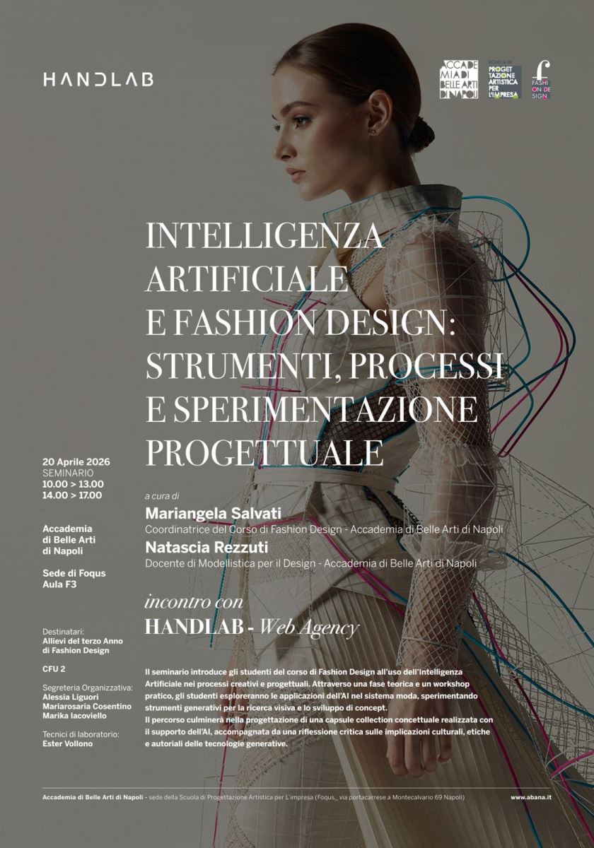 L’Accademia di Belle Arti di Napoli promuove il seminario “Intelligenza Artificiale e Fashion Design: strumenti, processi e sperimentazione progettuale”, a cura di Mariangela Salvati, docente di Fashion Design, e Natascia Rezzuti, docente di Modellistica per il Design, in collaborazione con HandLab Agency, agenzia di comunicazione e laboratorio creativo attiva nei settori moda, beauty e lifestyle.