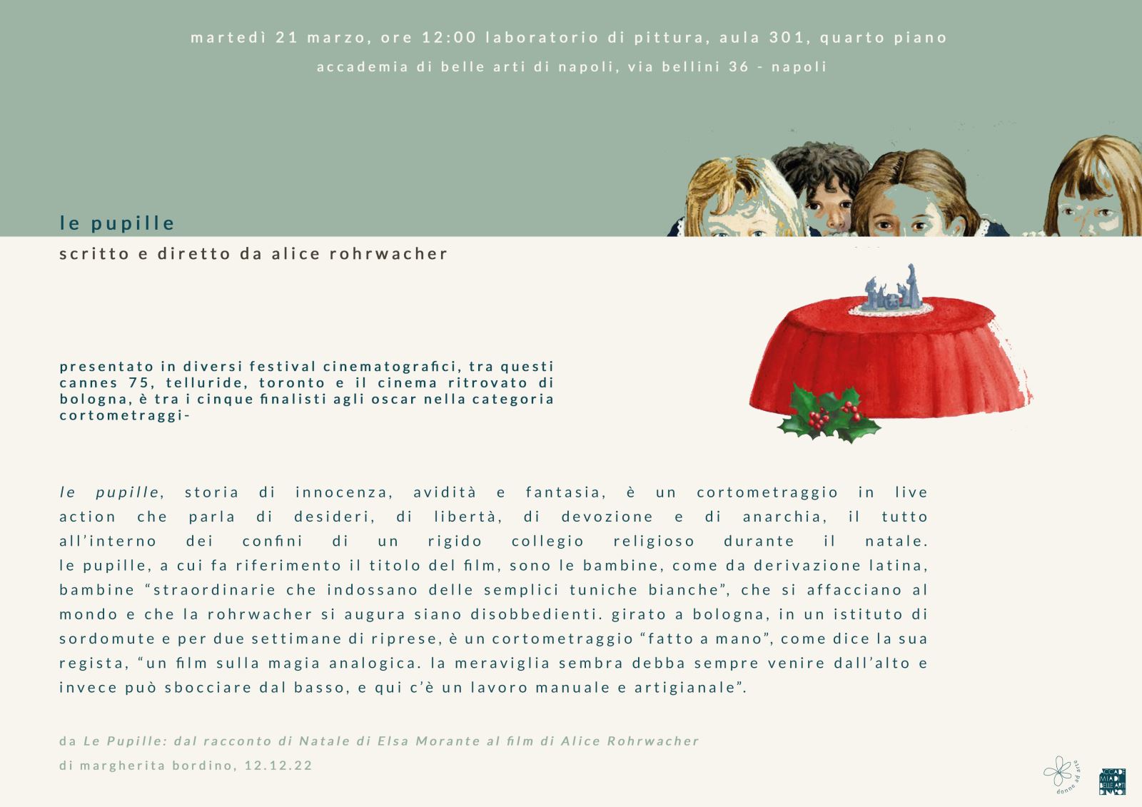 "le pupille" di alice rohrwacher proiezione a cura di donne ad arte martedì 21 marzo ore 12 laboratorio di pittura, aula 301