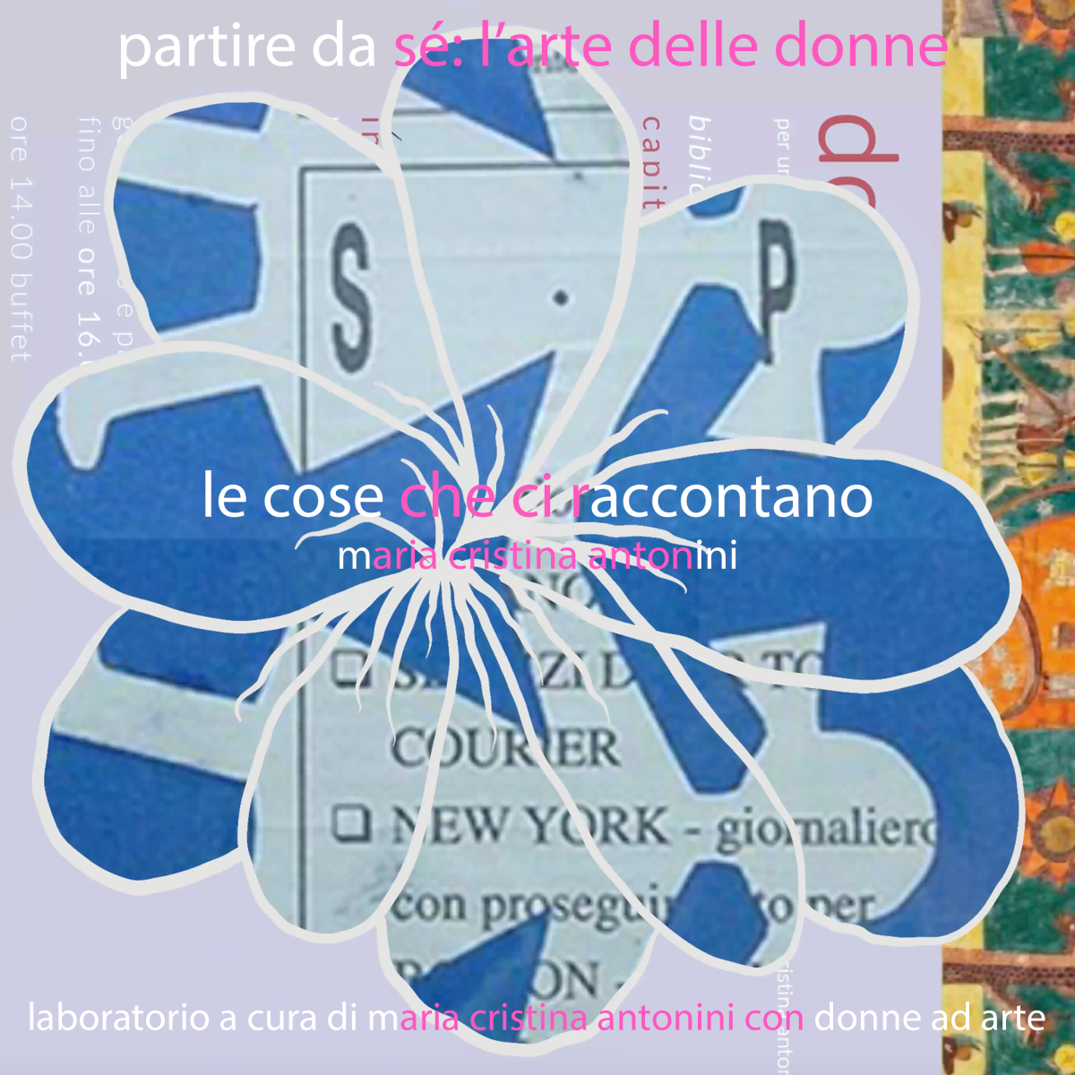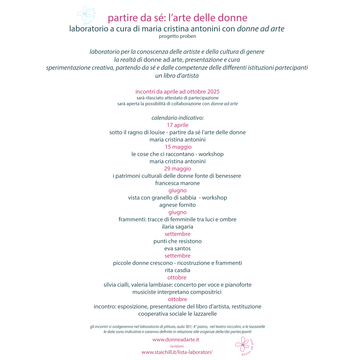 giovedì 15 maggio, alle ore 12.30, come da calendario, nel laboratorio di pittura, aula 301, 4°piano, avrà luogo il secondo incontro del laboratorio "partire da sé: l'arte delle donne", a cura di donne ad arte, nell'ambito del progetto proben, con il workshop "le cose che ci raccontano", condotto da maria cristina antonini -