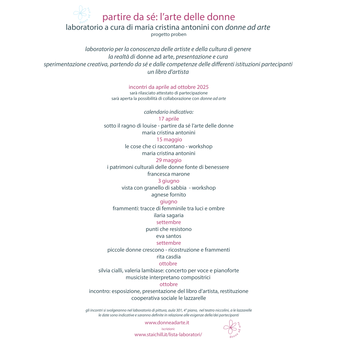 giovedì 29 maggio, alle ore 12.30, come da calendario, nel laboratorio di pittura, aula 301, 4°piano, avrà luogo il terzo incontro del laboratorio "partire da sé: l'arte delle donne", a cura di donne ad arte, nell'ambito del progetto proben, con la lezione "i patrimoni culturali delle donne fonte di benessere" condotto da francesca marone -po la lezione, continueremo il laboratorio, quindi si ricorda di portare il proprio oggetto e i quadernini donati al primo incontro -