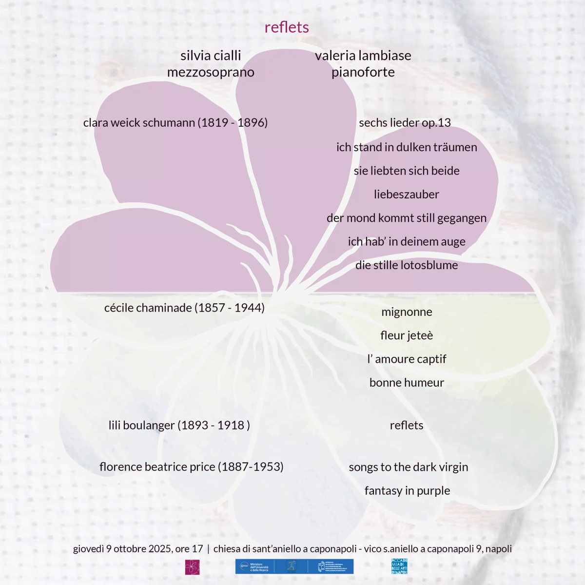 giovedì 9 ottobre 2025 ci sarà l'incontro conclusivo del laboratorio "partire da sé: l'arte delle donne" a cura di donne ad arte, nell'ambito del progetto proben, con il concerto "refletcts", alle ore 17, nella chiesa di sant'aniello a caponapoli.