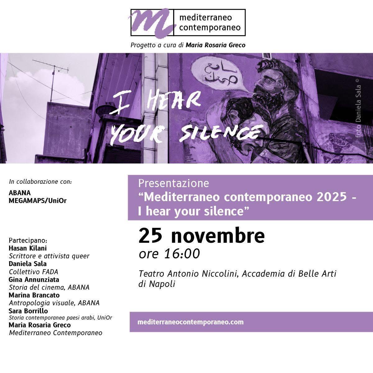 Incontro di presentazione del progetto Mediterraneo contemporaneo 2025 - I hear your silence, con Hasan Kilani (scrittore e attivista queer femminista, palestinese giordano) Daniela Sala (collettivo FADA), Gina Annunziata (storia del cinema, ABANA), Marina Brancato (antropologia visuale, ABANA), Sara Borrillo (Storia contemporanea dei Paesi Arabi, UniOr) Maria Rosaria Greco (Mediterraneo contemporaneo).