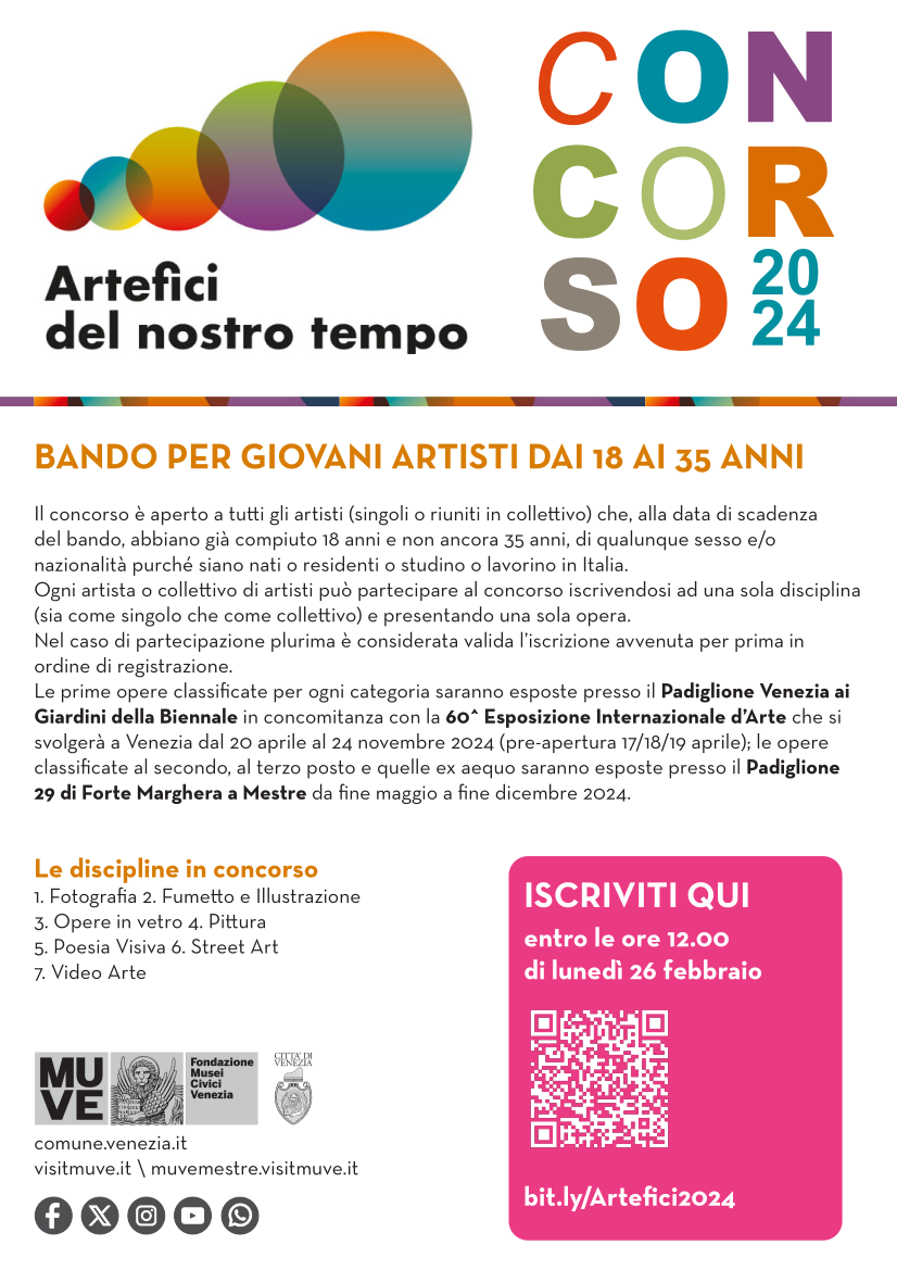 Si segnala alle allieve e agli allievi interessate/i la quinta edizione del concorso “Artefici del nostro tempo”, bandito dal Comune di Venezia in collaborazione con Fondazione Musei Civici di Venezia, Fondazione Forte Marghera, Venis Spa e Vela Spa.